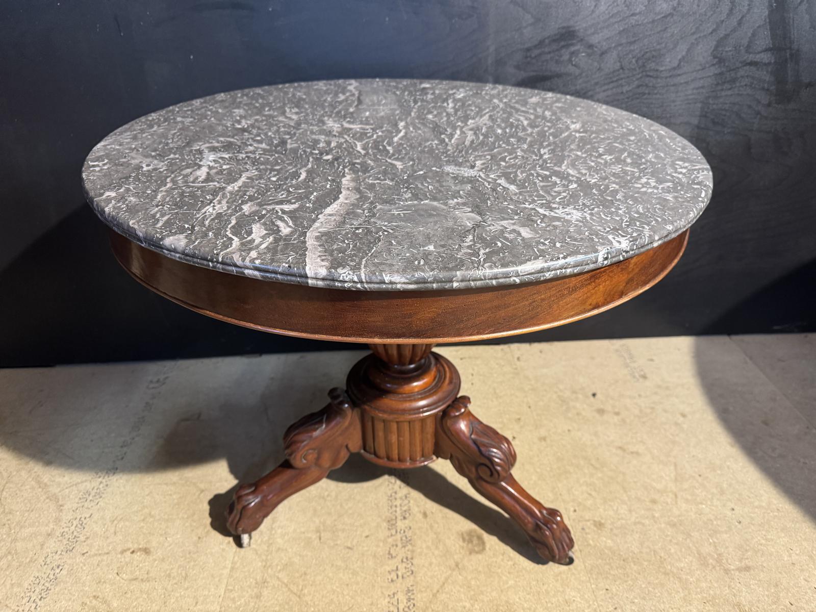 A lovely French Gueridon Table dating to the mid 19th Century. Variegated Grey original marble top with mahogany Base. In overall excellent original condition for the home.